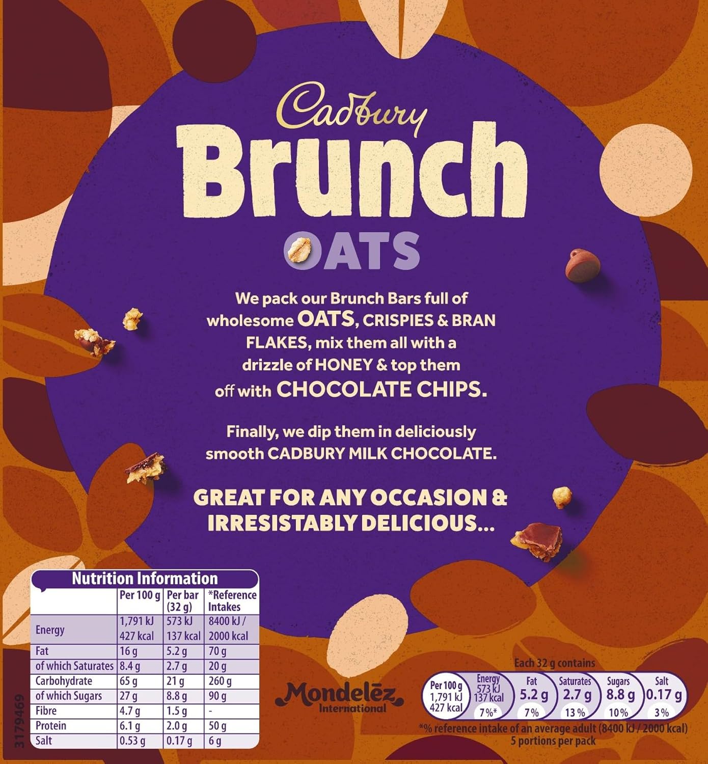 Cadbury Brunch Bar Choc Chip 5 Pack x8 Box offers unbeatable value on one of the UK’s favourite snack bars. Packed with wholesome oats, crisped rice, and delicious chocolate chips, each bar is finished with a signature Cadbury milk chocolate drizzle. With 8 packs of 5 individually wrapped bars, this multipack bulk case is ideal for households, meal prep, kids’ lunchboxes, vending stock, or office snacks. Made with no artificial colours or preservatives, it’s a treat you can feel good about.